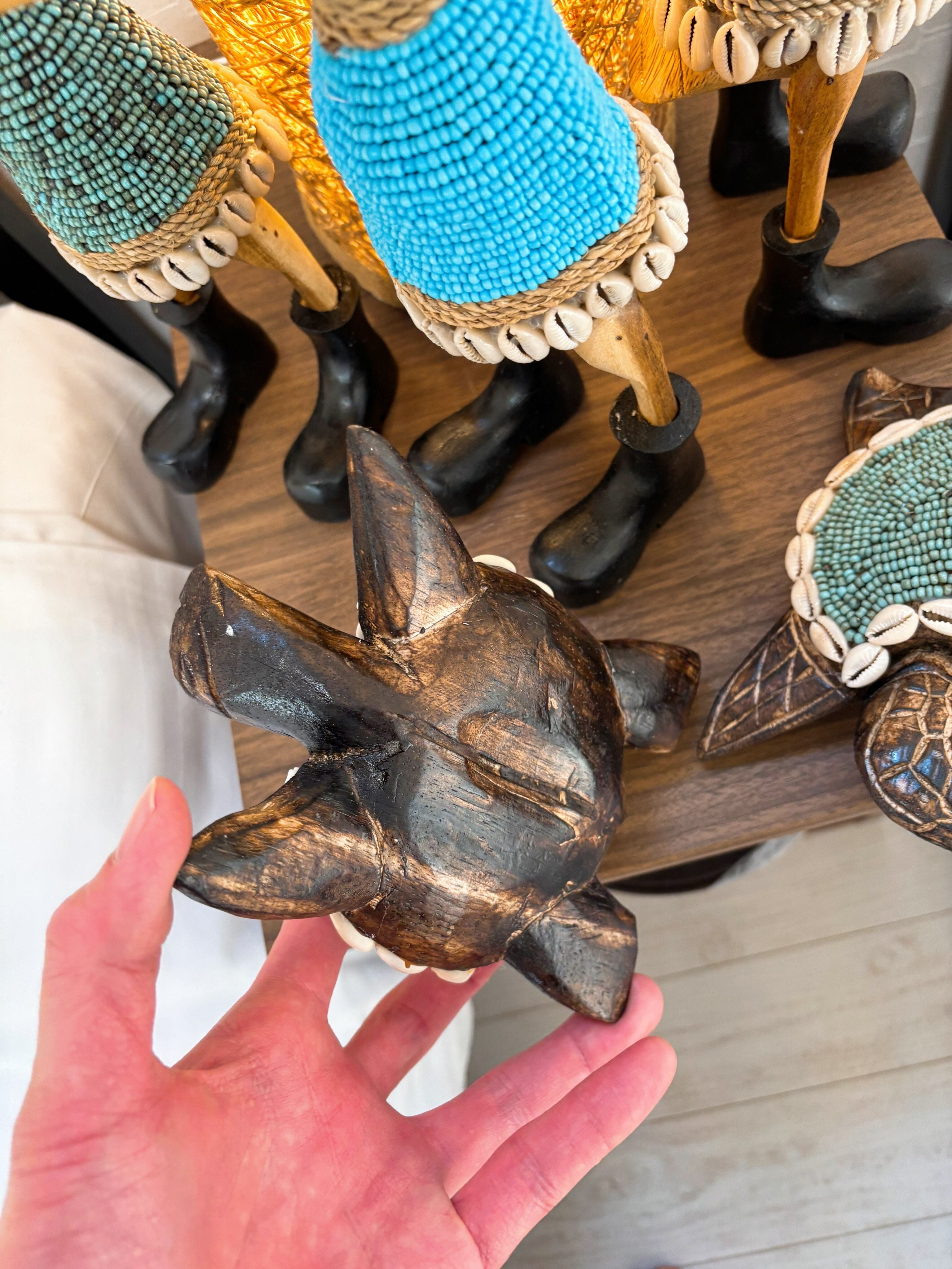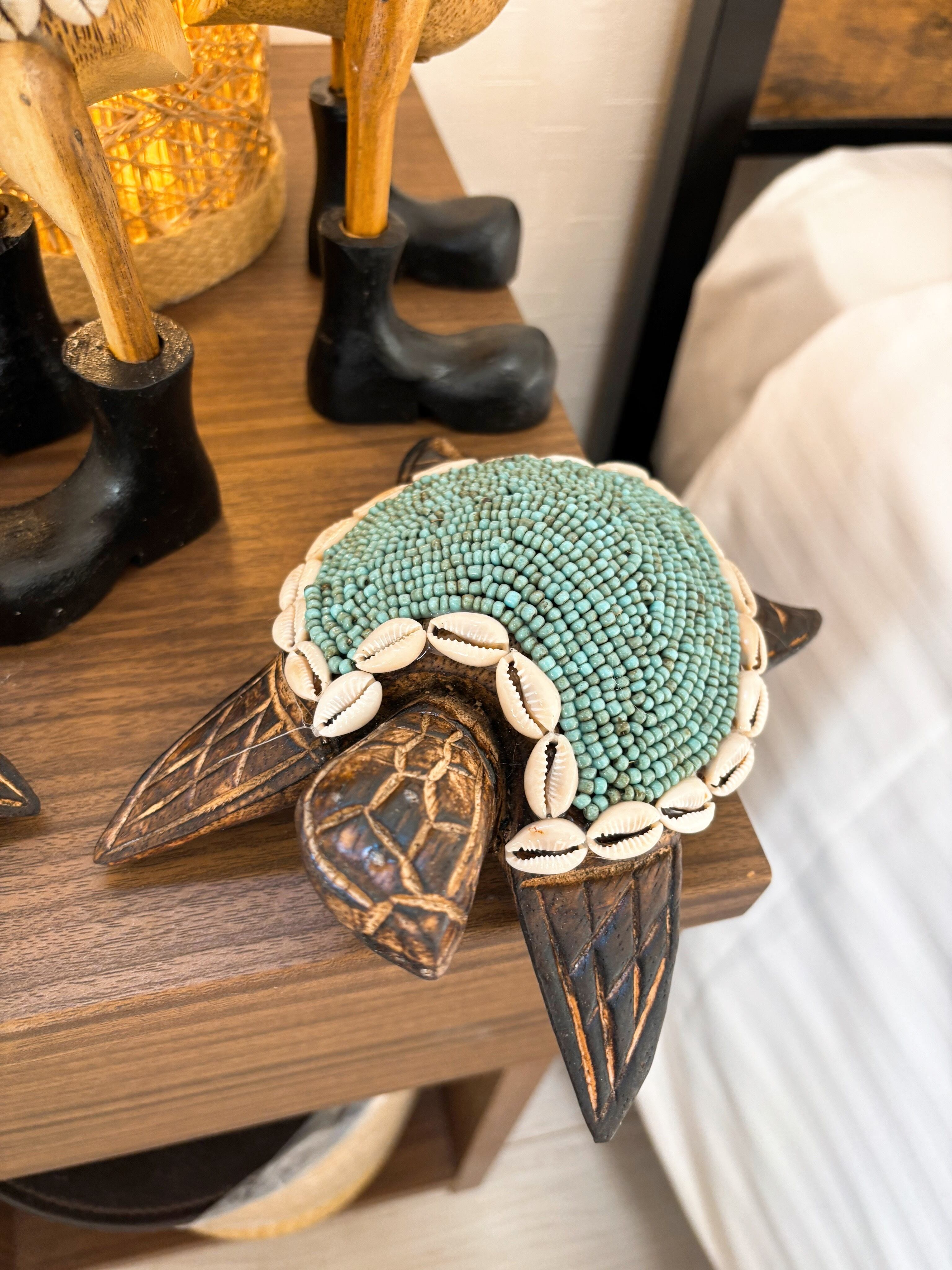 天然タカラ貝とビーズのドレスを身に付けた、木彫りのウミガメ