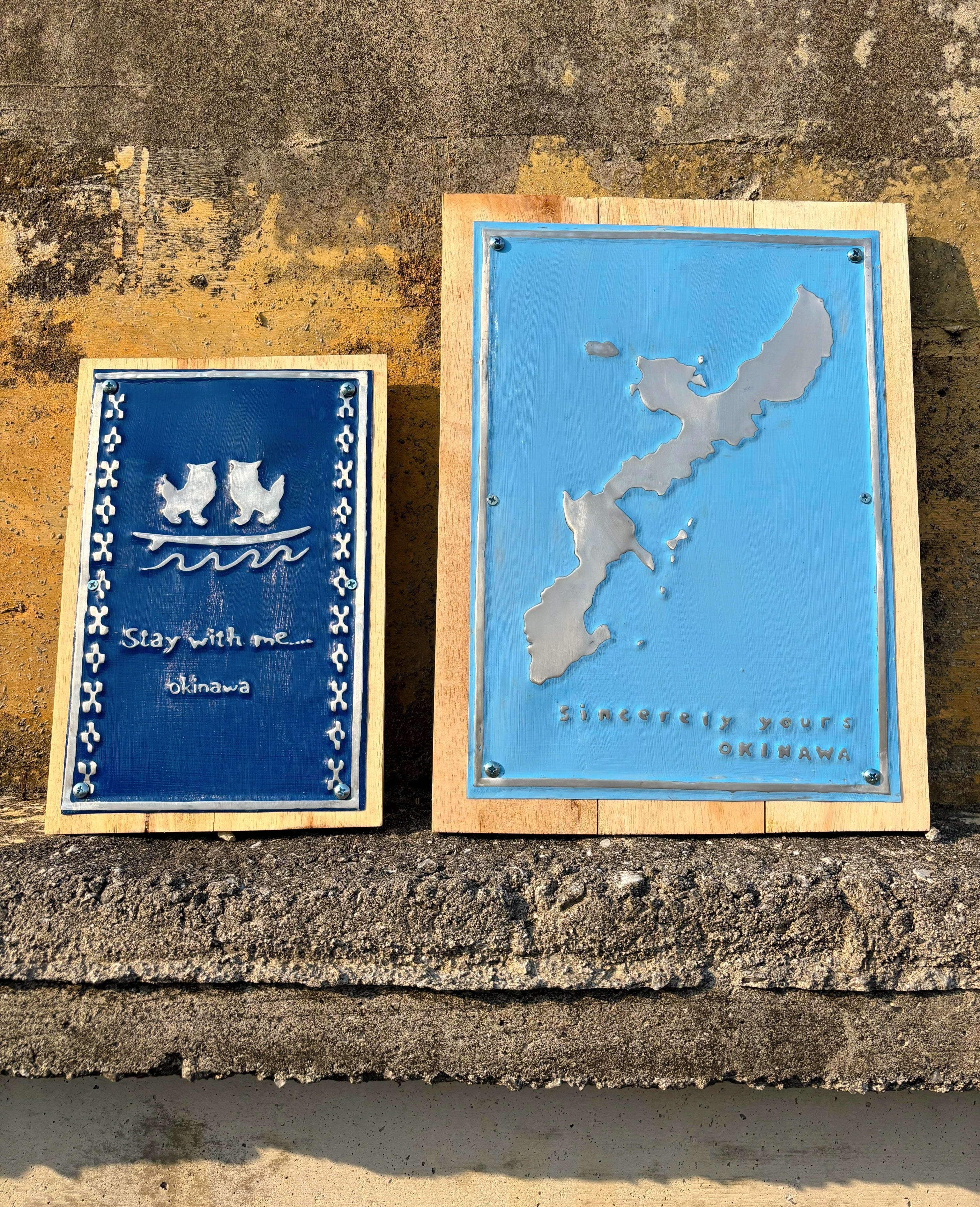 サーフボードの上で仲良く遊ぶシーサーが、優しくおうちを見守るアルミプレート。 版画を彫り、その上からアルミ板を打ち付けて模様を出したあと着色して作られています。 職人の「技」を感じる、他にはないインテリア。 サイズ横20cm×縦30cm
