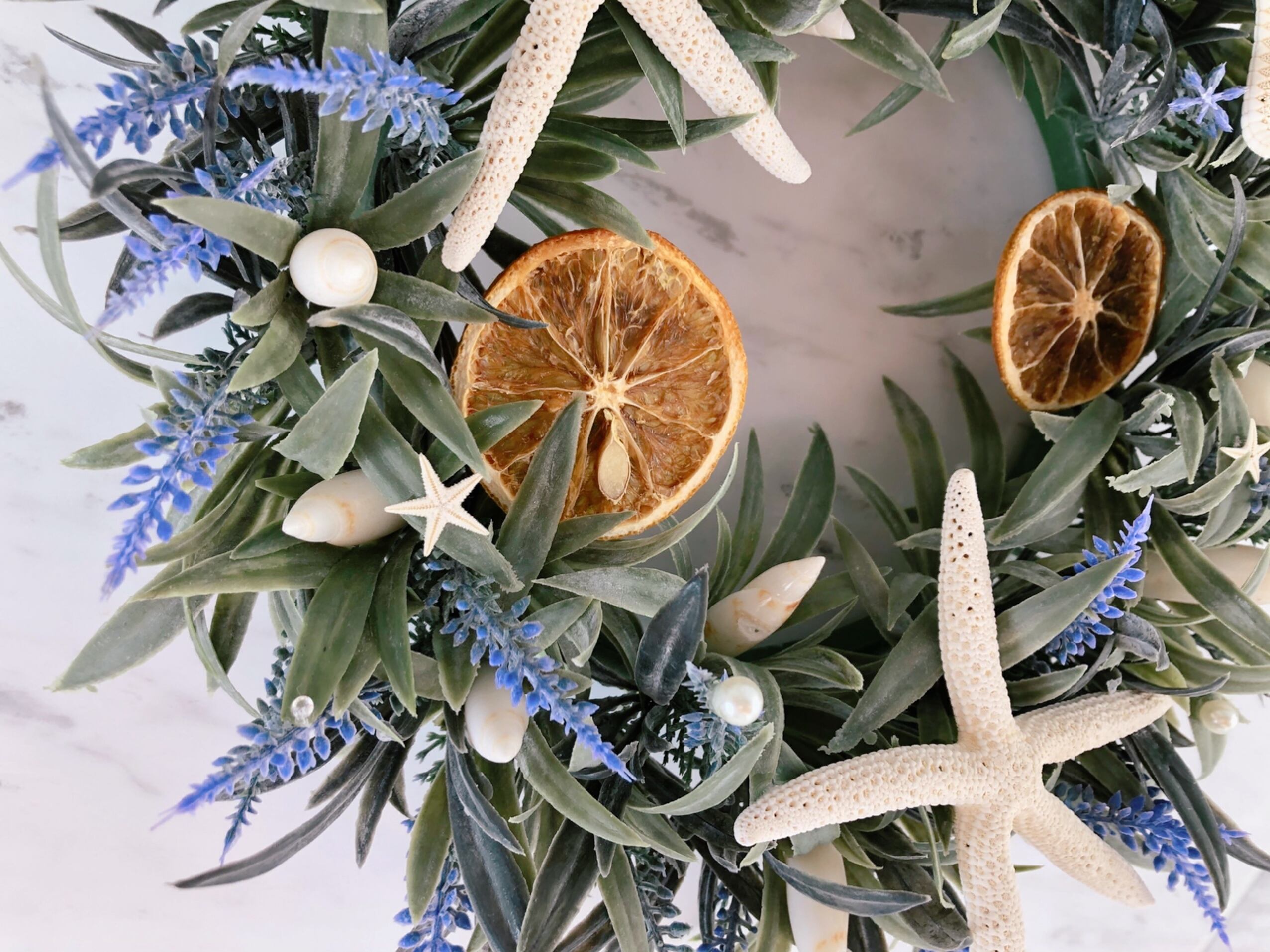 ラベンダーリースをヒトデと細長いトンボ貝でデコレーション。