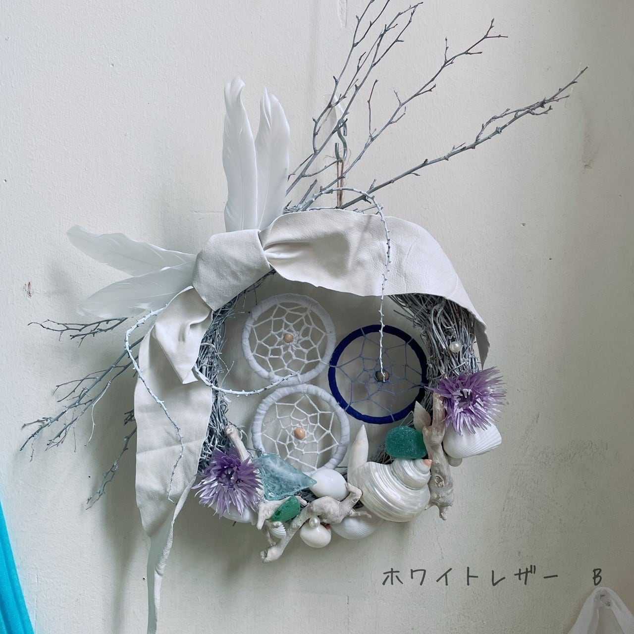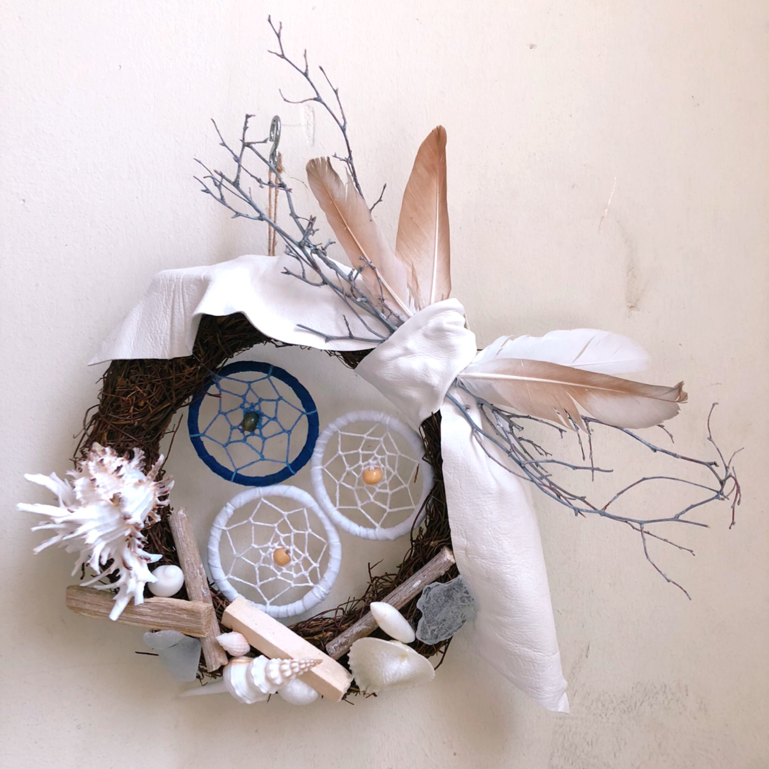 ドリームキャッチャーリース。 大きなレザーが輪郭を引き締めます。 リース土台直径 約20cm 全体の大きさ 約27cm×27cm