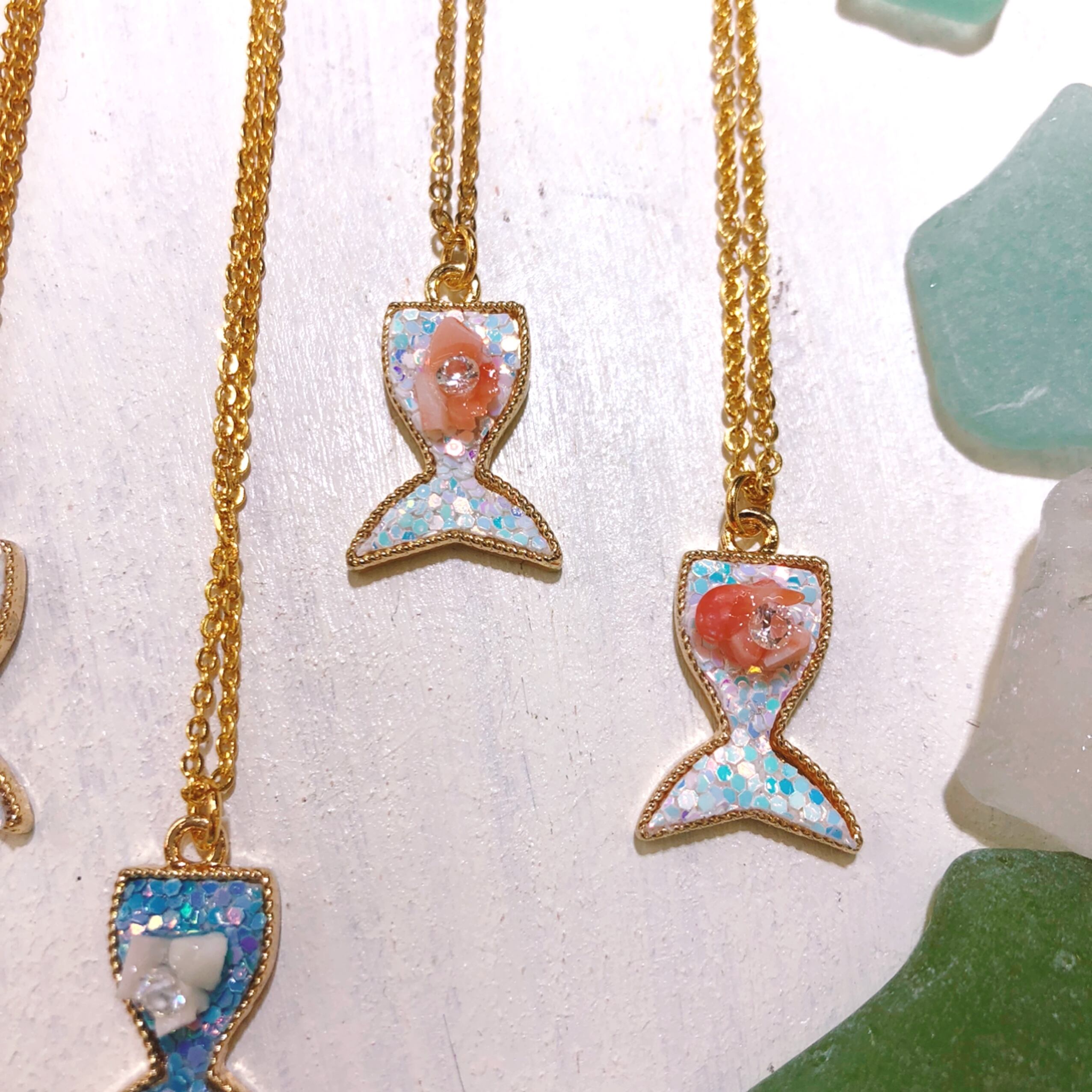 キラキラ輝くマーメイドテイルのネックレス⭐️ ホワイトには主にピンクサンゴ、ブルーには白サンゴを中心にあしらいました✨ トップ長さ 約1.7cm