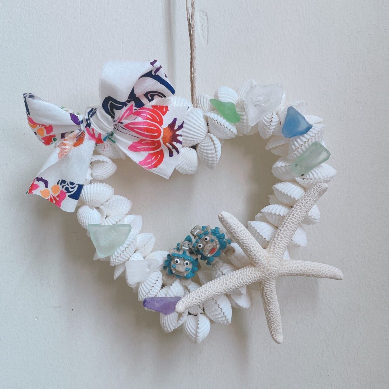 紅型模様のリボンが沖縄らしいシェルリース⭐️ たて16cm よこ16cm (吊り紐含まず)