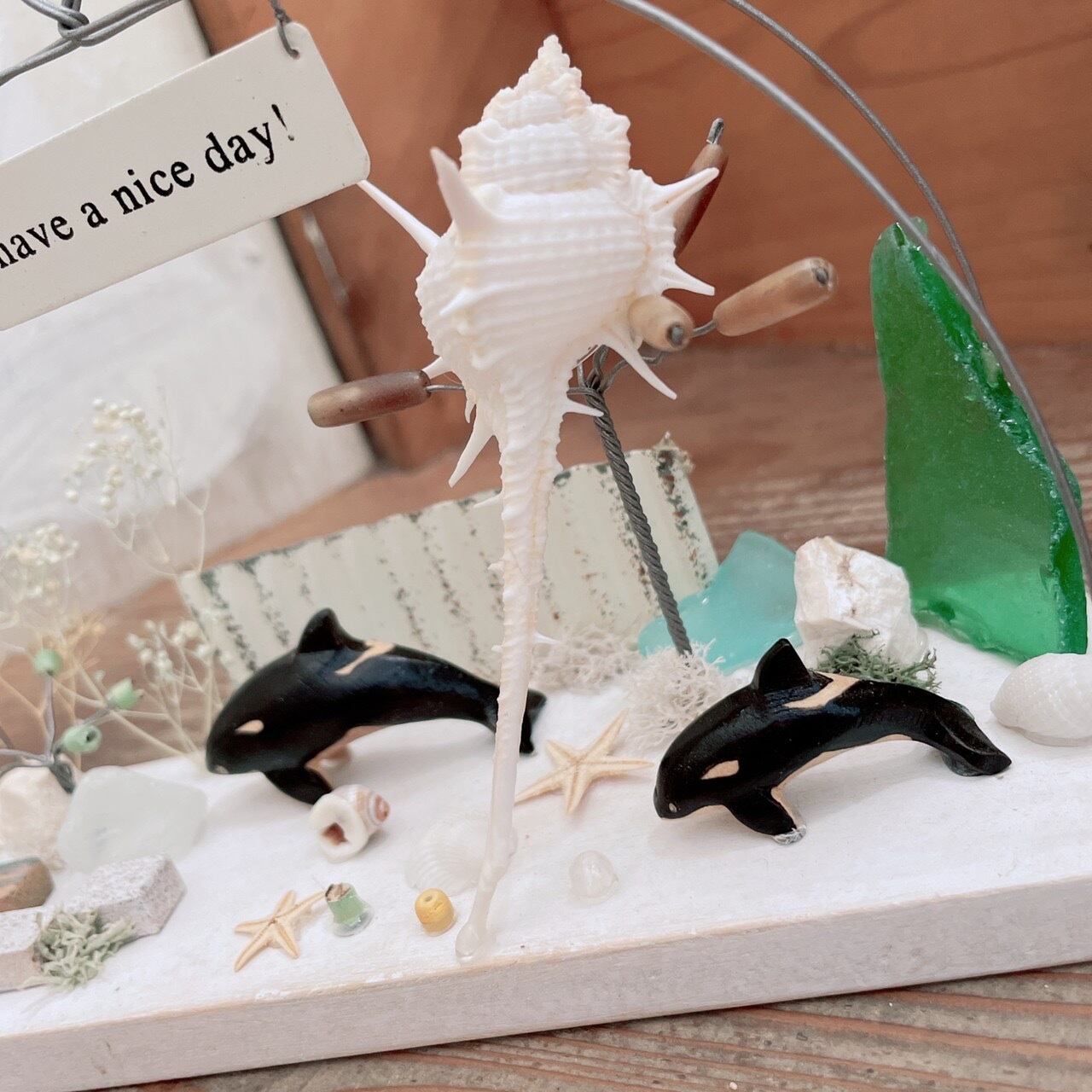 暖かみ溢れる、木彫りの海のいきものが主役のジオラマです。