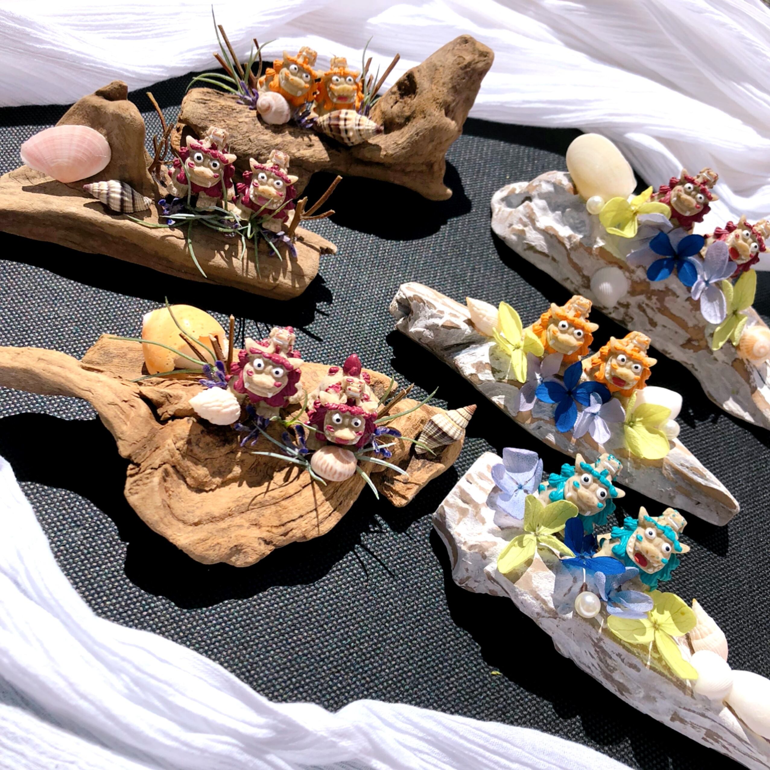 天然の流木に乗せたシーサーです。 形に合わせて貝や枝、ドライフラワーでデコレーションします。 2つと同じ形はない。オンリーワン商品⭐️ 横11〜16cm 高さ3〜6cm