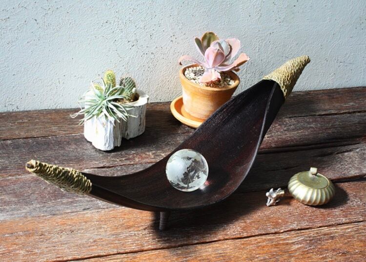 椰子の「がく」を1枚1枚固めて足をつけたトレイ。先端に巻きつけたパンダンがワンポイント。