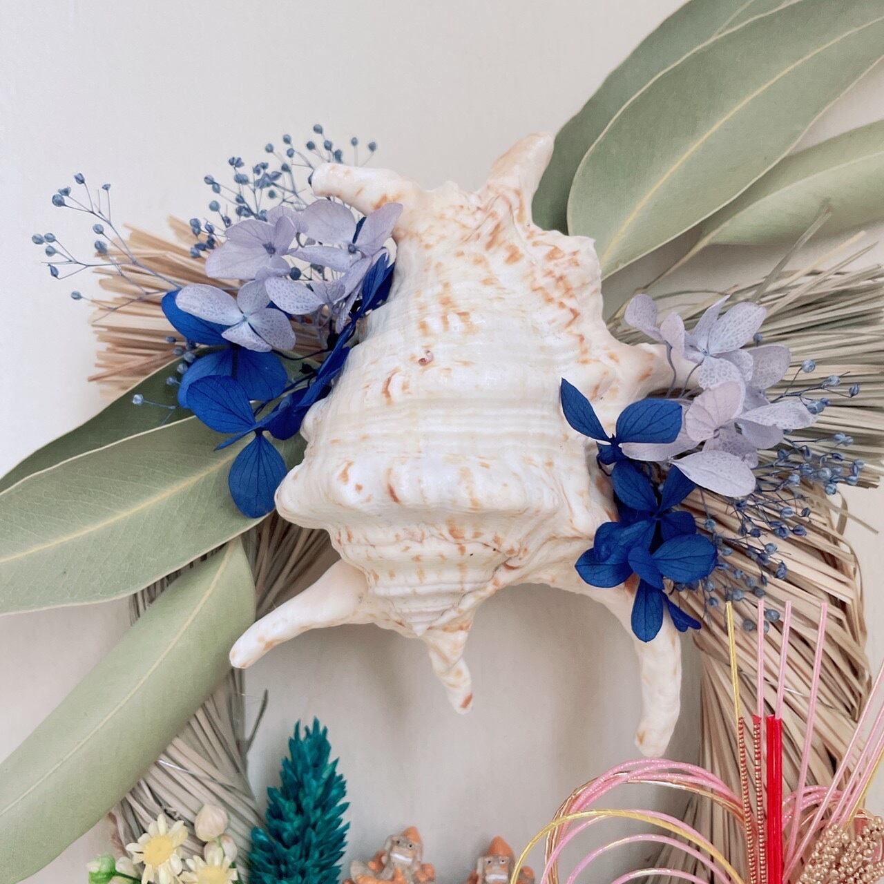 魔除けの水字貝をトップにたくさんのドライフラワー、シェルの間から仲良しのシーサーが顔を出します。