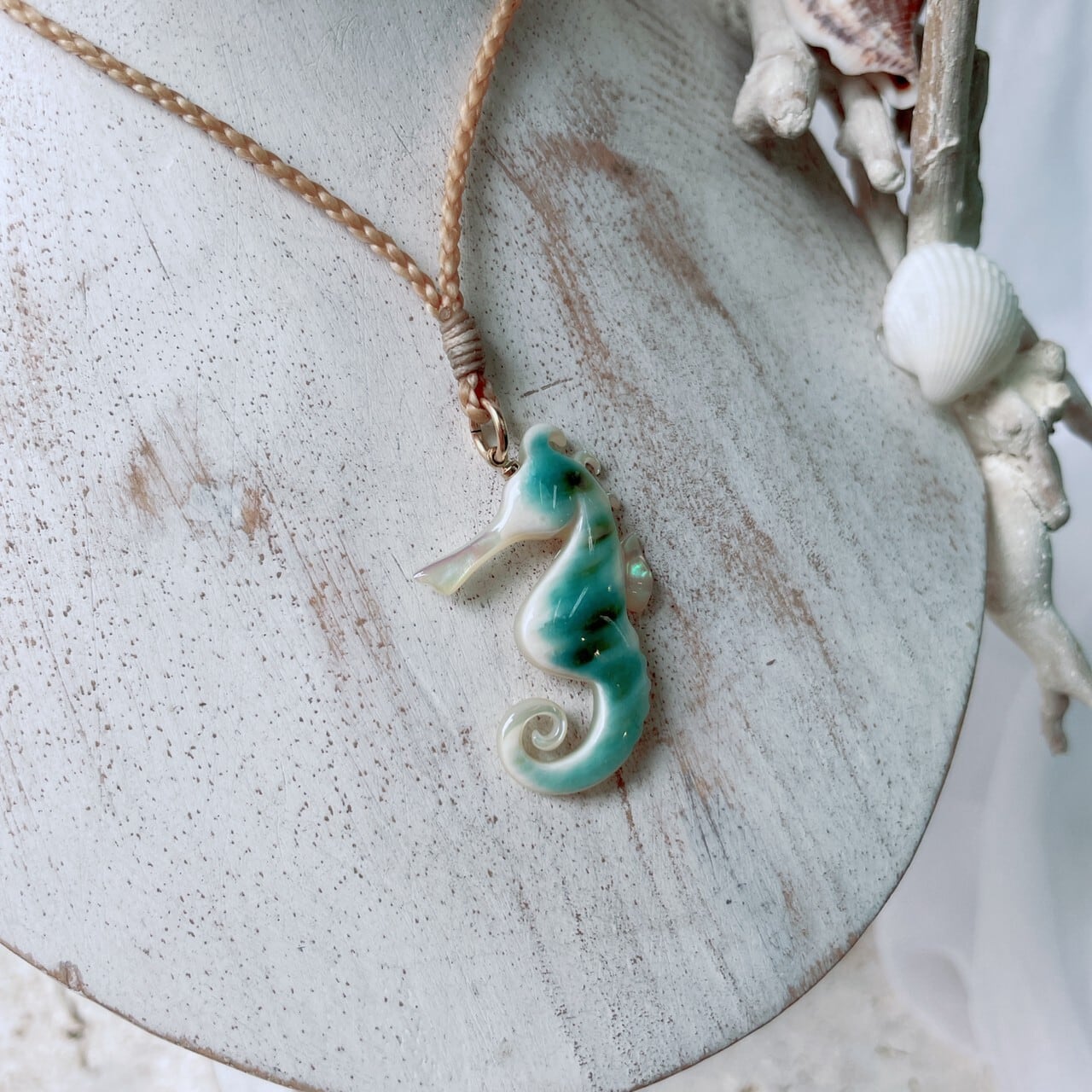当店裏手、「アトリエ海辺のさんぽ」制作の夜光貝ペンダント。
