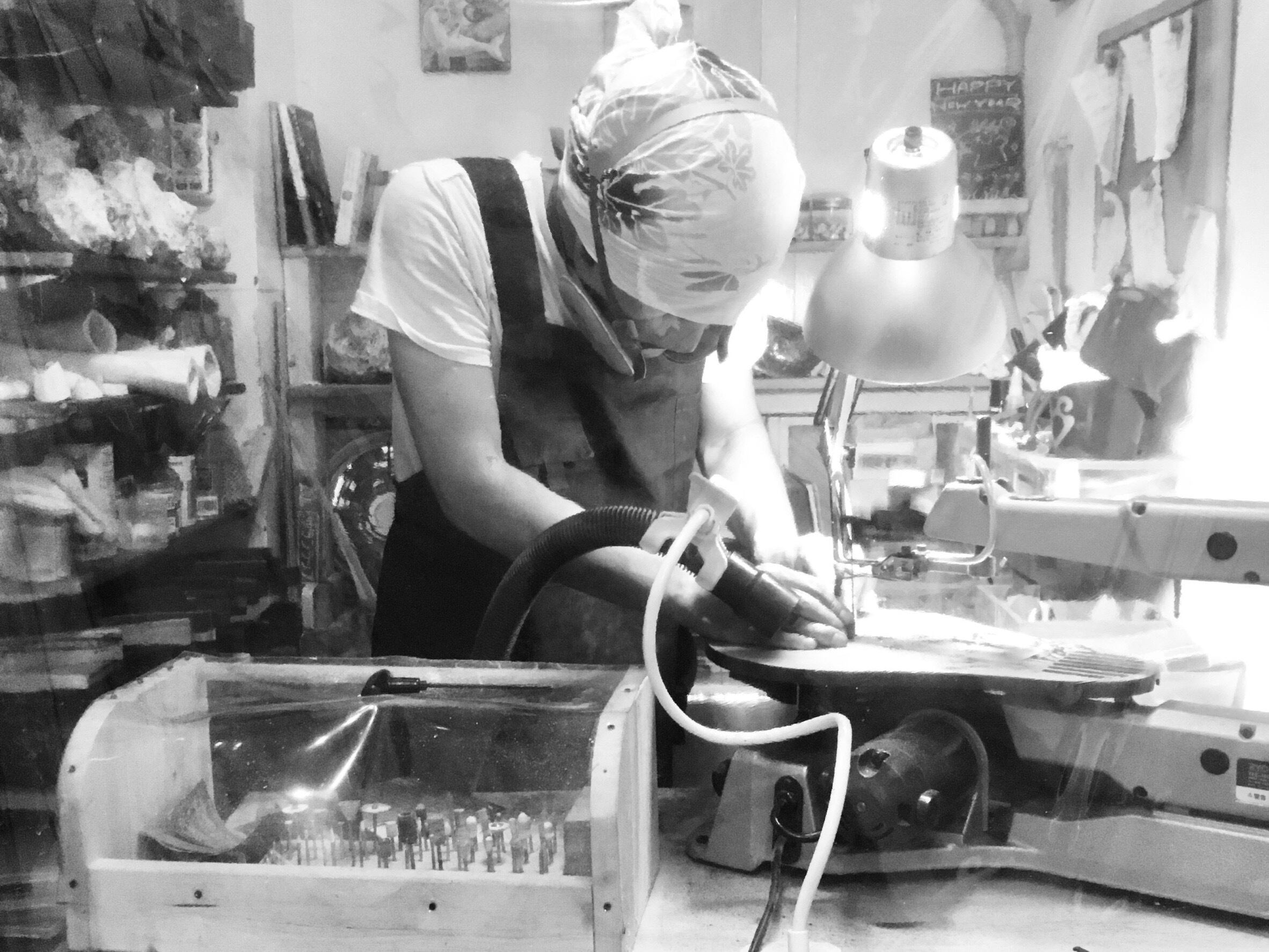 当店裏手、「アトリエ海辺のさんぽ」制作の夜光貝ピアス。