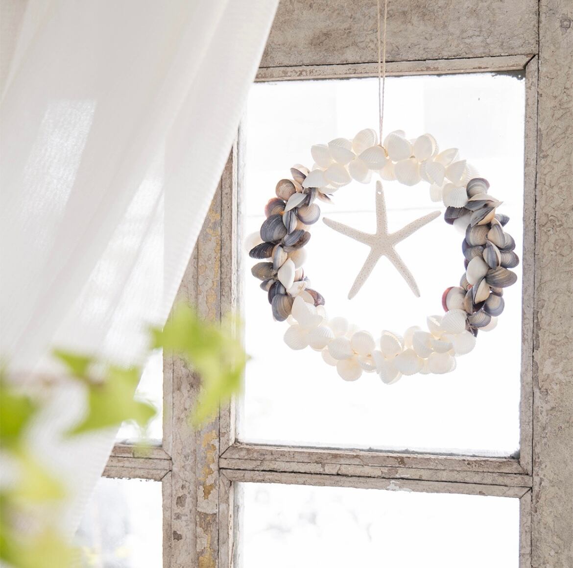 ホワイトとパープル、2色のシェルリース。 白い壁に存在感を発揮します。 アンティークなインテリアとの相性もバッチリ⭐️ サイズ 約横16×ヒモ含む長さ30cm
