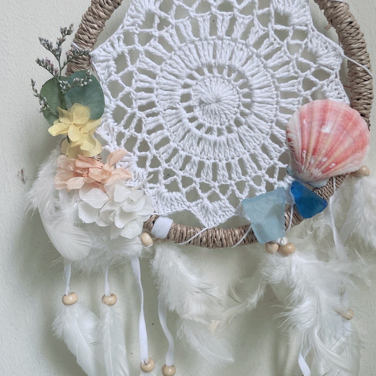 ドライフラワーや貝がらがたっぷり! 沖縄県内作家による、人気の刺繍ドリームキャッチャー⭐️ たて38cm(ひも含まず よこ20cm