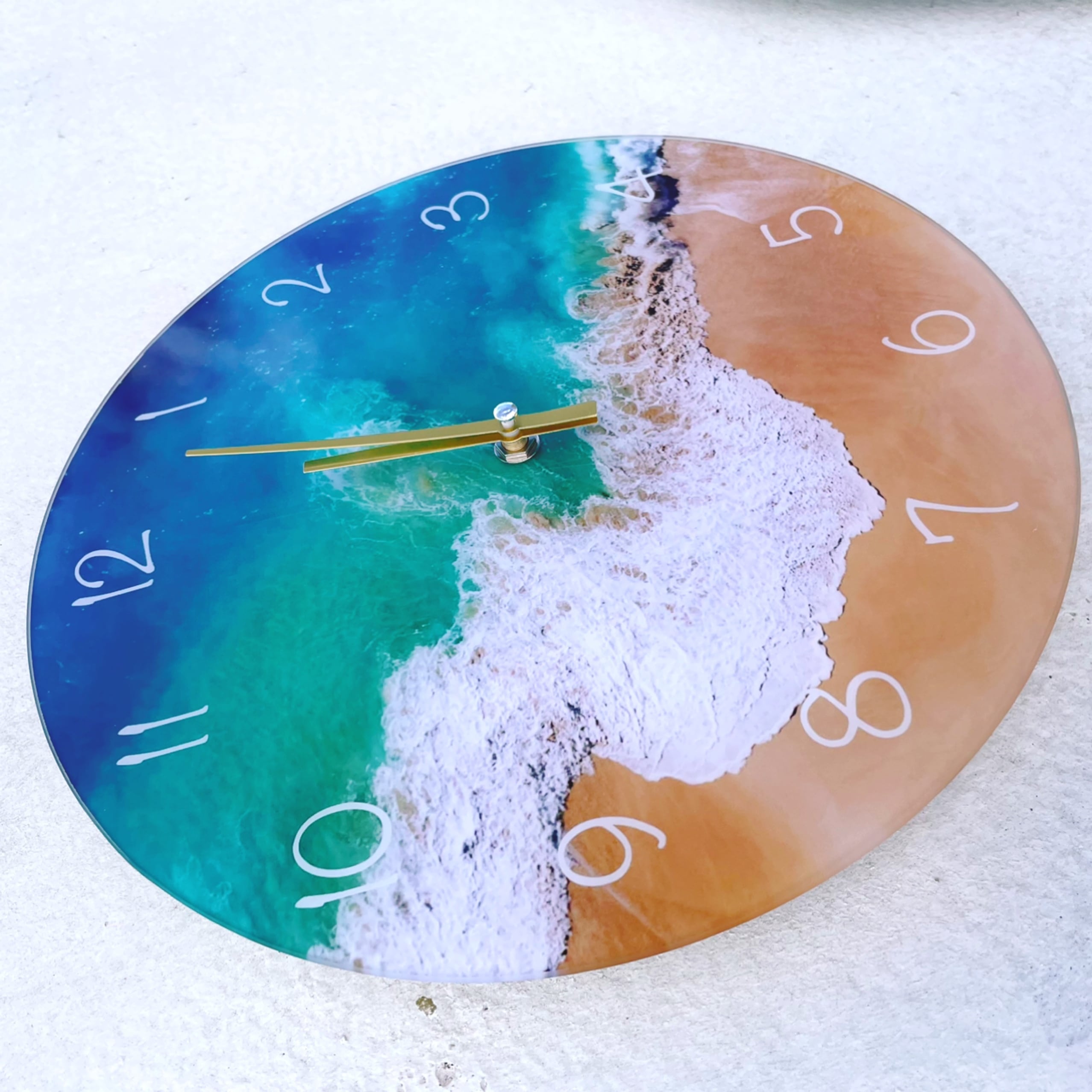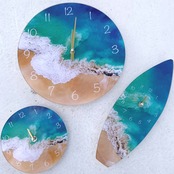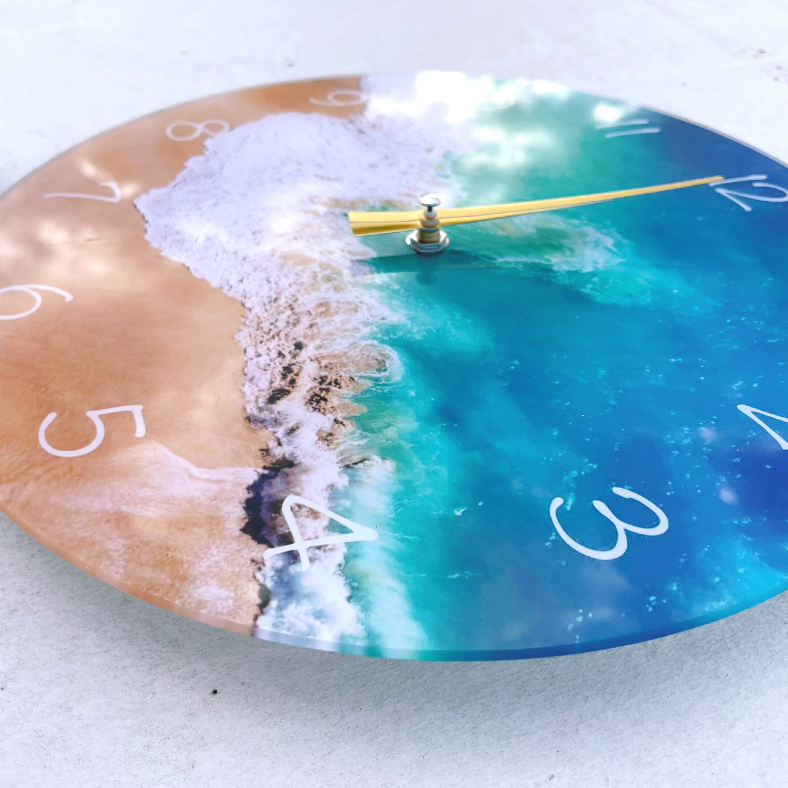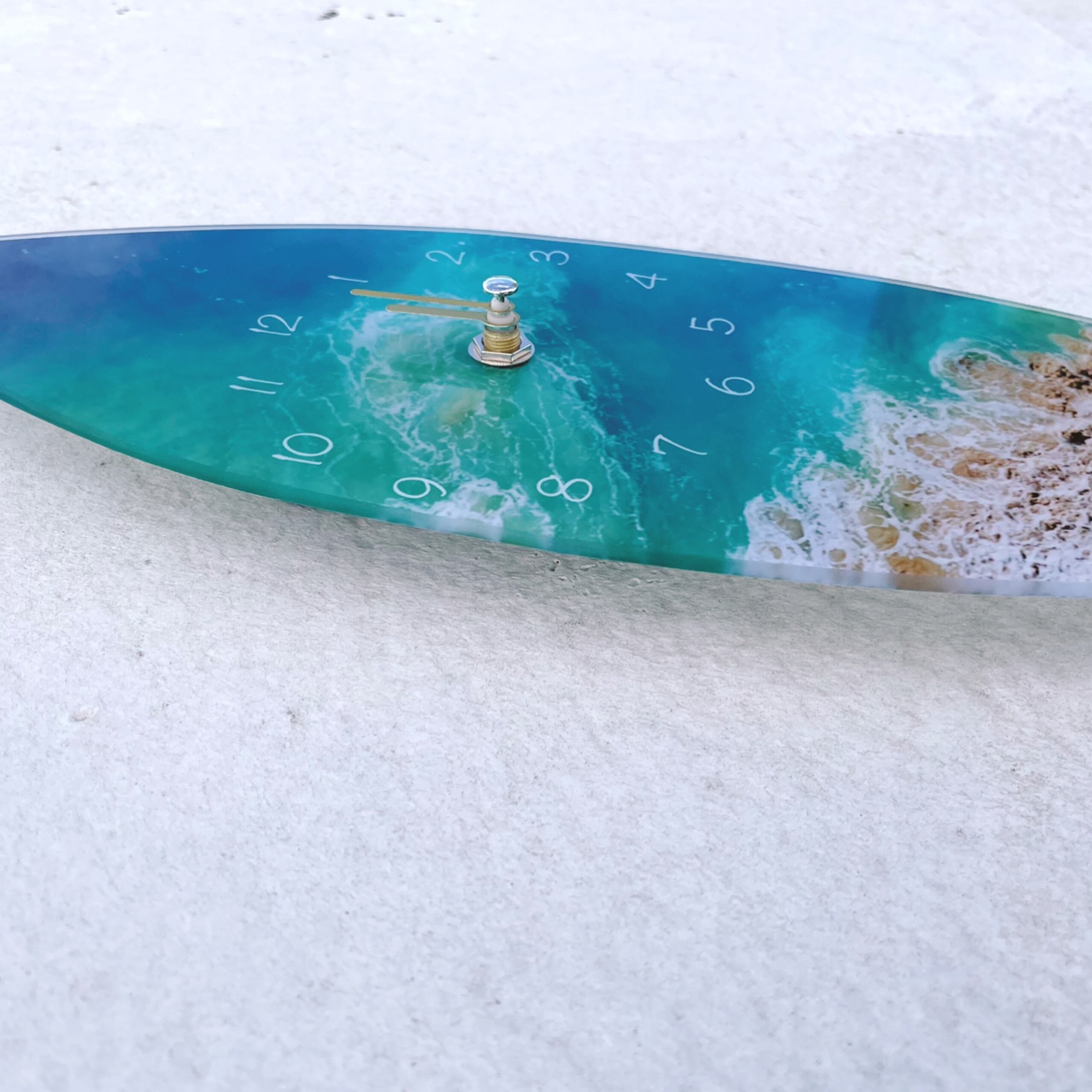 ガラスにみずみずしい海がプリントされた時計。 空間を一気にさわやかに彩ります。 サイズ ラウンド 直径約30cm サーフボード 35cm×12cm