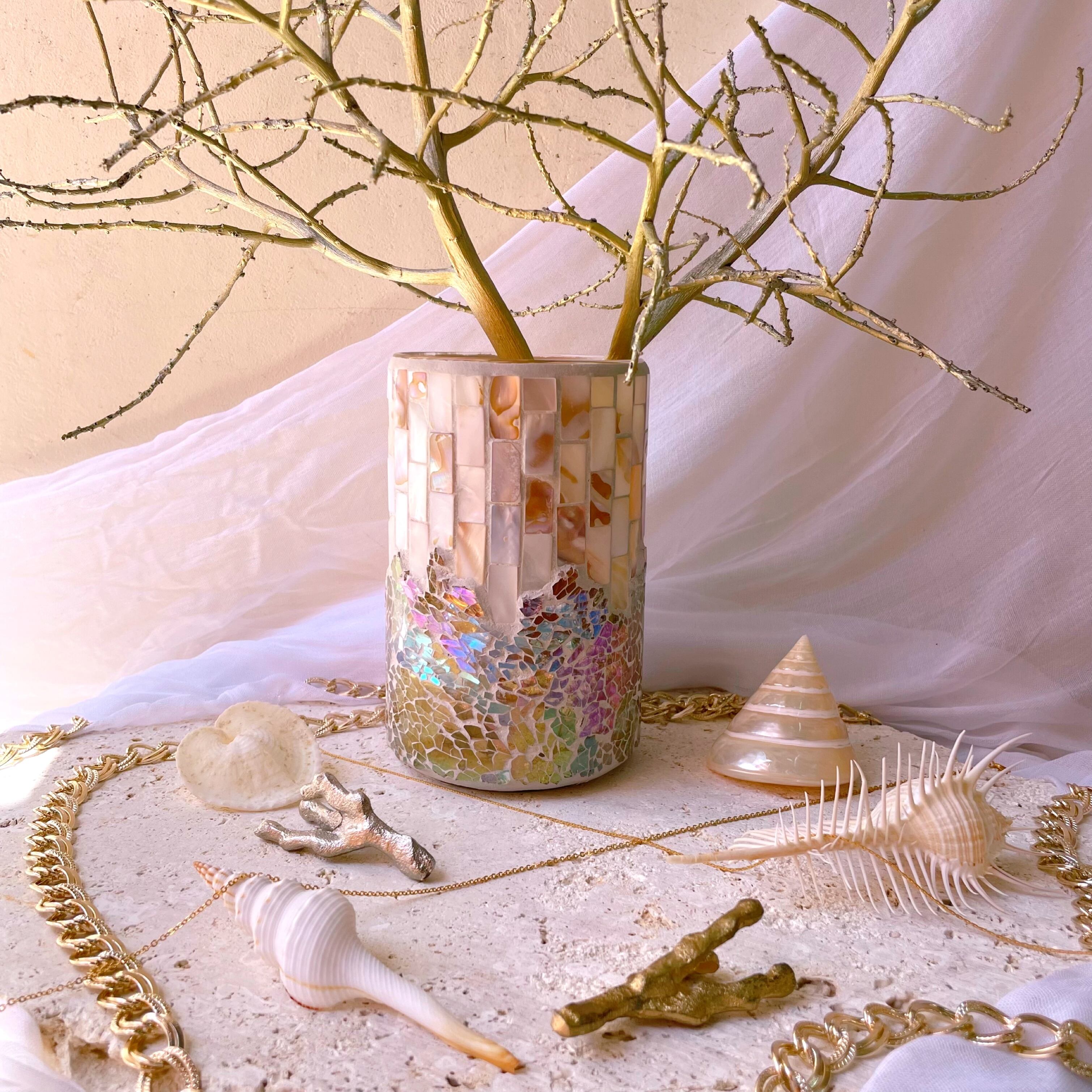シェルとモザイクガラスの花瓶。 水を入れてご使用可能です。 直径9cm 高さ15cm