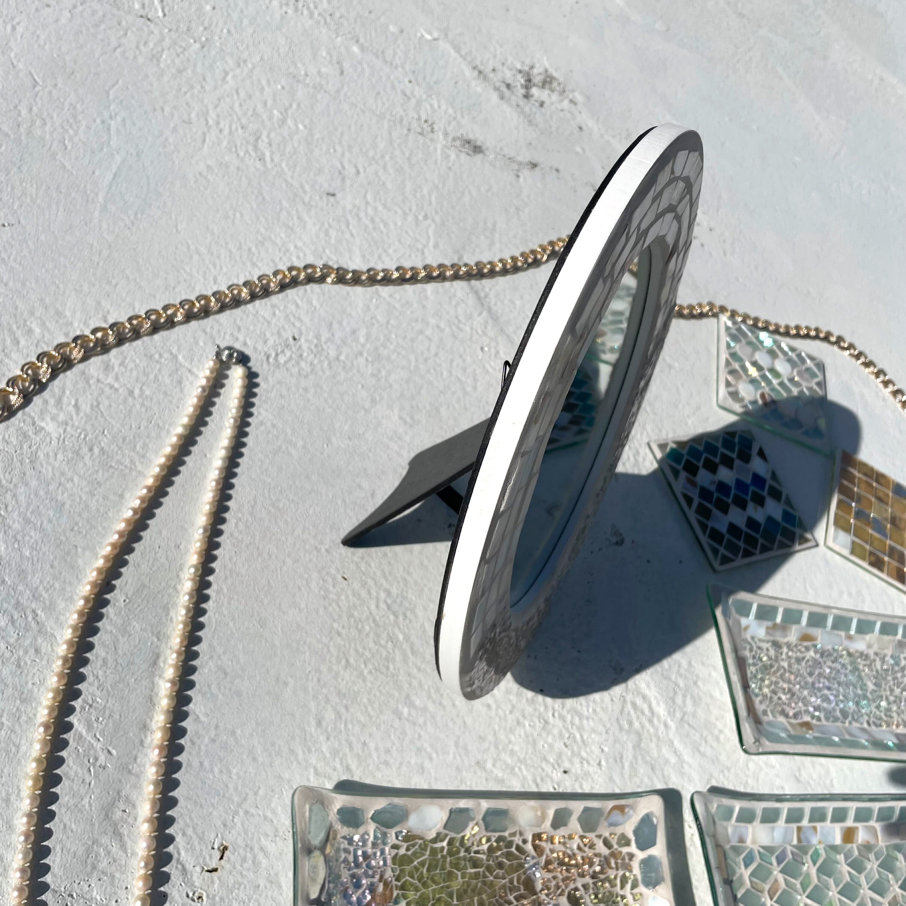 シェルとモザイクガラスが美しいミラー 壁掛けにかけるためのカンと、立てて使うためのスタンド付きです。 サイズ 29cm × 24cm