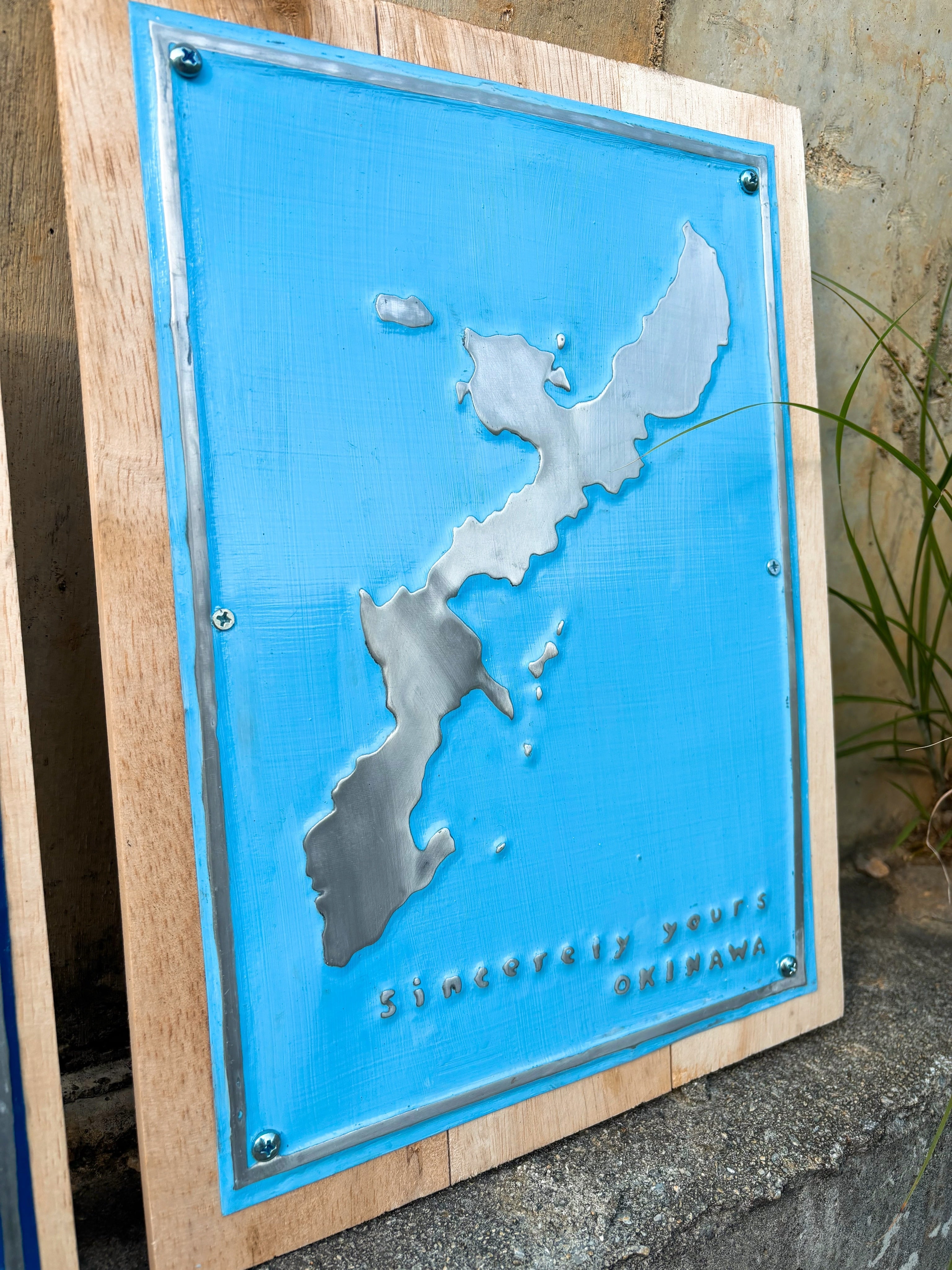 版画を彫り、その上からアルミ板を打ち付けて模様を出したあと着色して作られています。